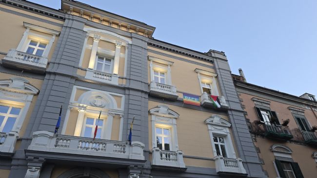 La bandiera della Palestina sventola dal balcone del municipio. Un gesto voluto dal sindaco Luigi Vicinanza, che ha accolto così la giornata di mobilitazione generale indetta in tutta Italia per dire no alla guerra e agli orrori che da mesi sconvolgono la Striscia di Gaza.