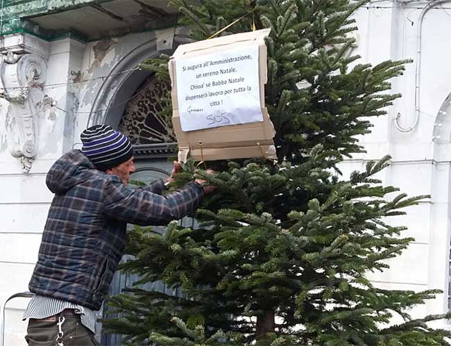 «Si augura all'amministrazione un sereno Natale. Chissà se Babbo Natale dispenserà lavoro per tutta la città». E' questo il testo del messaggio che un disoccupato di Castellammare ha deciso di lasciare all'amministrazione comunale in questo particolare periodo dell'anno. Proprio come se fosse la classica letterina che tutti i bambini scrivono, l'uomo ha deciso di pubblicare il cartello sull'albero di Natale presente all'esterno del Comune di Castellammare. Anche quest'anno, purtroppo, sono diverse le famiglie che vivono in gravissime condizioni economiche in attesa di essere reintegrate nel ciclo produttivo. Molti disoccupati sono in attesa dell'aiuto della politica, sia locale che regionale. Si spera che con l'ingresso di Castellammare nelle aree di crisi ci siano dei miglioramenti notevoli come auspicato anche dall'amministrazione comunale. In attesa, comunque, di tempi migliori, qualche disoccupato prova a ricordare al Comune le difficili condizioni di vita di molte famiglie con un messaggio semplice, ironico ma soprattutto diretto: il sindaco «Babbo» è chiamato a dare delle risposte nel prossimo anno.