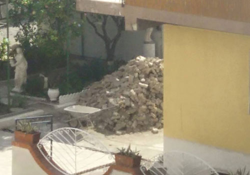 Questa ormai famosissime betonelle, lo ricordiamo, una volta tolte andavano smaltite. Proprio il costo di questa adempienza, non preventivata nel progetto esecutivo dei lavori di restyling della villa comunale, ha reso necessaria una modifica del progetto stesso con la riduzione dei costi di altre attività proprio per reperire fondi allo smaltimento delle betonelle. Ed ora, almeno da quanto si vede da questa foto, sembrano essere finite a casa di un privato, che sembra essere anche titolare di una ditta edile locale.