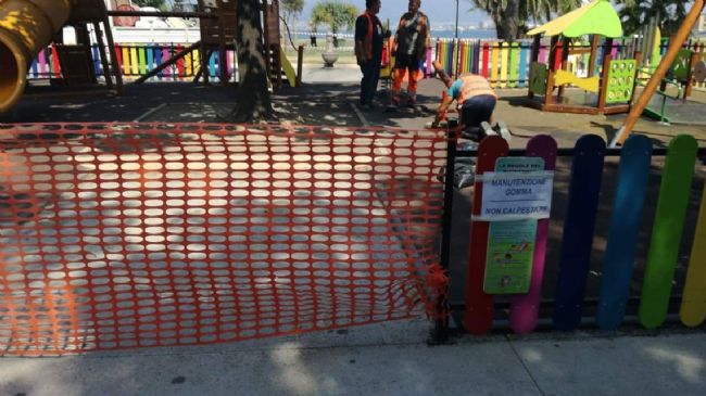 Giostre in manutenzione in villa comunale a Castellammare di Stabia. Per l'assestamento del nuovo pavimento antitrauma resteranno chiuse fino a domani.
