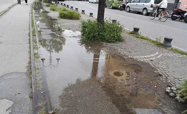 Da settimane ormai i pedoni sono costretti ad effettuare un vero e proprio slalom per evitare di impelagarsi nella pozzanghera.