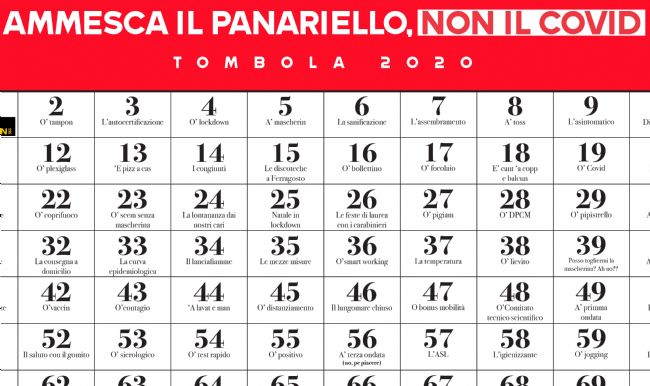Sì, perché è proprio alle persone, di qualsiasi fascia d’età, che il progetto si rivolge: ci siamo fatti spiegare meglio le finalità da Vincenzo: “Tutto nasce da una domanda, un’esigenza: cosa posso fare per sensibilizzare (se ancora ce ne fosse bisogno, ma a quanto pare sì, visti gli ultimi preoccupanti dati) le persone alla prevenzione e alla diffusione del contagio dovuto dal Covid-19? Ed è qui che nasce il progetto “TOMBOLA 2020- AMMESCA IL PANARIELLO, NON IL COVID”, che si inserisce nell’importante partita della sensibilizzazione ai comportamenti e alle buone pratiche da adottare per prevenire il contagio, come una nuova chiave di lettura, diversa e divertente; è proprio attraverso il gioco, - aggiunge Vincenzo - in questo caso quello della classica tombola napoletana, che voglio dare (in maniera alternativa) un messaggio sociale di impatto, ovvero quello di indossare sempre la mascherina, lavare le mani ed evitare gli assembramenti, a tutti i cittadini, perchè come diceva Gigi Proietti, un grande della comicità italiana che proprio in questo 2020 ci ha lasciati “Io non scherzo mai, io gioco. Sì, il gioco è una cosa serissima. Perché chi scherza lo fa per divertirsi, ma chi gioca, s'illude, s'inventa un lieto fine.. che non arriva mai.” Speriamo, invece, che in questo caso ci sia un lieto fine.