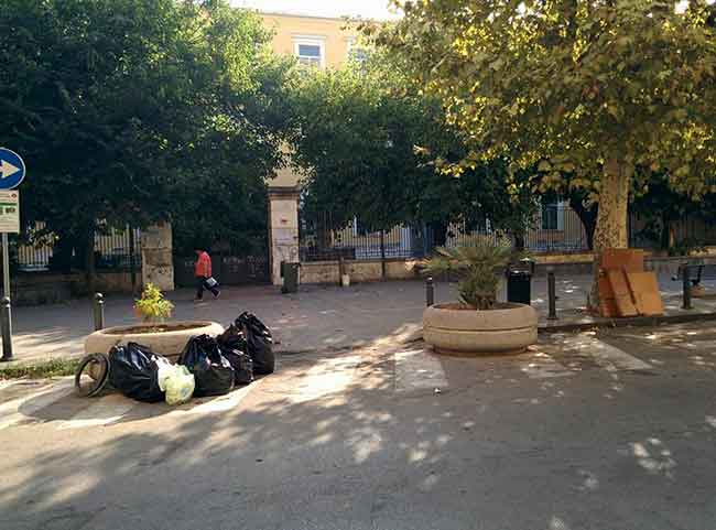 «Quest'area – hanno detto - , oltre ad essere punto preferenziale per l'indifferenziata di tutti i "civilissimi" cittadini del quartiere, è anche punto di raccolta di rumeni, bulgari e affini che sono soliti banchettare a pranzo e a cena, lasciando residui di cibo, bottiglie e altre schifezze ovunque sul piazzale! Nella vicina via Foscolo, come sempre sotto la finestra di un'aula, il solito sacchetto di immondizia probabilmente dei dirimpettai, che a questo punto immagino lo facciano proprio di proposito, avendo eletto il posto a loro personale area deposito...in barba alla salute dei bimbi che a breve occuperanno le aule della scuola e che percorreranno queste strade. Non hanno sorte migliore via Carducci e via M. D'Auria».