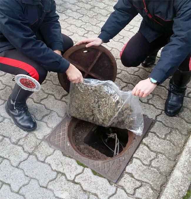 Nel rione ‘Savorito’ di Castellammare di Stabia i militari dell'arma hanno circondato uno stabile di 6 piani, ispezionando una ventina di abitazioni e aree condominiali. Scoperchiando tutti i tombini attorno alla palazzina, all’interno delle condotte i militari hanno trovato 1 chilo e mezzo di marijuana (chiusa in un bustone di plastica, ancora da suddividere in dosi), 250 grammi di cocaina già divisa in dosi e quasi 80 grammi di hashish.