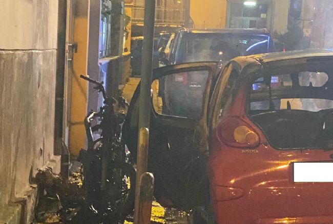 Uno scooter in fiamme, un’auto danneggiata ed anche la facciata di un palazzo coinvolta dall’incendio che stanotte è divampato in via Paride del Pozzo, la stradina che si trova a pochi passi dalla fermata Circum di Via Nocera. Una notte da incubo per i residenti del luogo, destati dal sonno dalla colonna di fumo nero che ha invaso le abitazioni, causando danni in particolare ad un appartamento situato al piano terra che è stato anche lambito dalle fiamme. I residenti si sono ritrovati la triste sorpresa dei panni stesi ridotti in cenere e di una finestra deformata dal calore dell’incendio che ha ridotto la moto in una vera e propria carcassa sul marciapiede antistante. Ed anche una Toyota di colore rosso ha riportato danni evidenti, con bruciature ad una fiancata e alla portiera sul lato del conducente. I residenti del luogo sono scesi in strada, terrorizzati dall’accaduto. Sul posto sono intervenuti i vigili del fuoco per spegnere le fiamme in piena notte e mettere in sicurezza l’area. Mentre i carabinieri della locale compagnia hanno effettuato i rilievi del caso sul luogo dell’incendio e stanno battendo diverse piste, inclusa quella che potrebbe condurre ad una vendetta criminale.