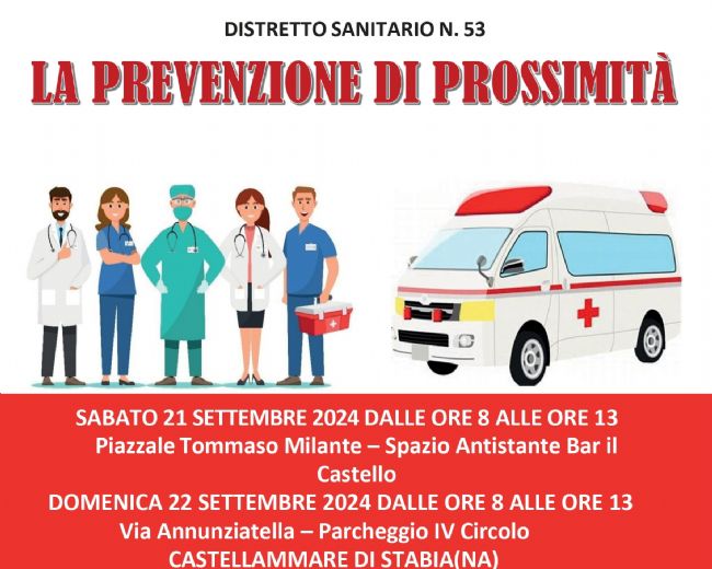 Grazie alla collaborazione tra il Comune di Castellammare di Stabia e l'ASL Napoli 3 Sud, torna l'appuntamento con la prevenzione gratuita per tutti i cittadini stabiesi. Sabato 21 e domenica 22 settembre sarà possibile, infatti, effettuare accertamenti gratuiti e senza prenotazione.