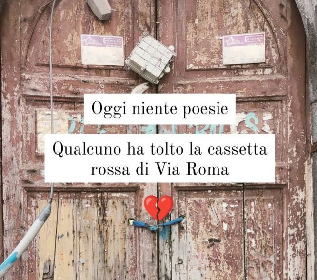 «Oggi niente poesie. Qualcuno ha tolto la cassetta rossa in Via Roma.» esordisce così con un emoji rappresentante un cuore spezzato l’autore del post che ieri sulla pagina Instagram bollettinopoetico ha segnalato la scomparsa della cassetta rossa utilizzata per lasciare le poesie. Dallo scorso gennaio era partita l’iniziativa per promuovere e diffondere la cultura a Castellammare. Un poeta, il cui nome rimane tuttora avvolto nel mistero, aveva posizionato una cassetta delle lettere su un vecchio porticato di Via Roma. All’interno, le sue poesie, da distribuire ogni settimana a più curiosi e appassionati. Un’iniziativa lodevole che ha suscitato l’interesse sui social dei più curiosi, intenti soprattutto a scoprire l’identità del poeta, che oltre a rendere noti i suoi capolavori alla città delle acque, pare aver lasciato le sue opere anche in una piazza di Bologna. Oggi quella cassetta è scomparsa e non è ancora chiaro dove, se e quando verrà restituita al proprietario.