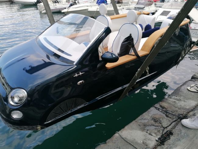 Una 500 che solca le acque. Non è fantascienza. E' ciò a cui i curiosi hanno assistito pochi giorni fa nel porto di Castellammare. In poco tempo il video che riprende il veicolo acquatico ha fatto il giro del web. Si tratta del progetto 500 Offshore, nato dall'idea di due giovani Campani, Dott. Antonio Galasso, 24enne giurista e Carmine Somma, 24enne meccatronico. Lo scopo del progetto è quello di unire un'icona Italiana al fascino Nautico, il tutto nella splendida cornice del nostro Golfo di Napoli. Il mezzo è alimentato da un Mercury Orion che gli conferisce delle prestazioni strabilianti insieme al comfort di una guida tradizionale, curando il design nei minimi dettagli. Particolari in acciaio lucido fanno da cornice allo scafo, risaltando un colore perlato che sfuma dal blu scuro al verde acqua marina portando in risalto le belle curve, succinte da un passamano in legno Iroko. Insomma un gioiello curato nei minimi particolari, dalle poltrone incise in acciaio, al pellame Bianco frau di bordo, al cruscotto cubicato in noce e le chaise-longue poste a poppa; per garantire il massimo comfort agli ospiti. Dalla dotazione di serie installata nel cruscotto, l’imbarcazione è dotato di infortainment Alexa su un impianto Boss marine ad interfaccia vocale, una plancia in acciaio con comandi per i servizi di bordo: luci di posizione, fari anteriori e posteriori, clacson, sentina e doccetta; con delfiniere Osculati per la risalita. Un progetto 100% Italiano, col cuore Napoletano, nato per affasciare il mondo.