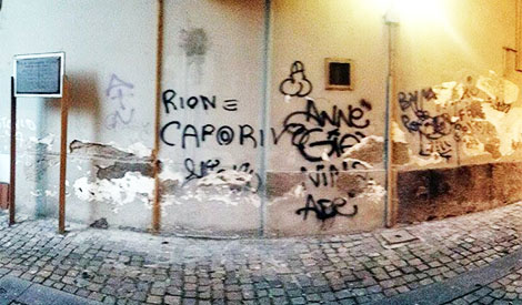 Un fenomeno del tutto simile a quello che ha visto vandalizzare il portone e le colonne della Chiesa di San Francesco di Paolo in Piazza del Plebiscito a Napoli. Molte le scritte con lo spray nero comparse negli ultimi tempi nella parte bassa del monumento sia sulla facciata rivolta verso la villa comunale, che del retro: si va da parole incomprensibili e senza senso a vere e proprie offese rivolte a ignoti.