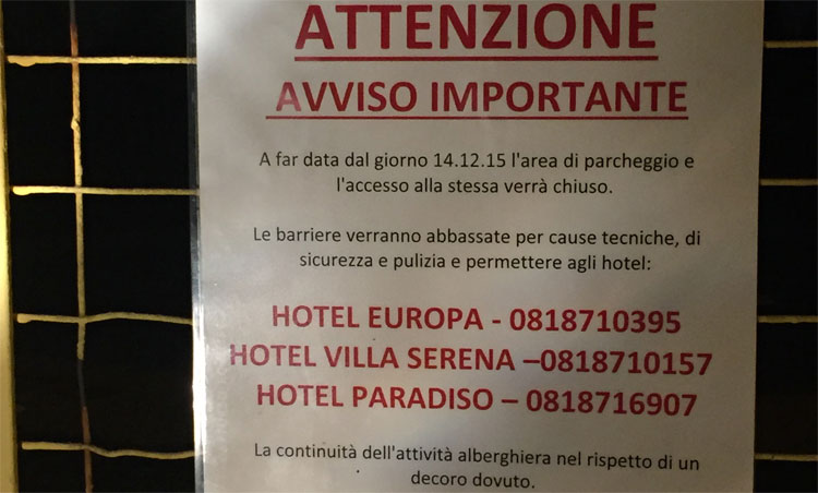 “A far data dal giorno 14.12.15 l’area di parcheggio e l’accesso alla stessa verrà chiuso – si legge nell’avviso – Le barriere verranno abbassate per cause tecniche, di sicurezza e pulizia e per permettere agli Hotel Europa, Villa Serena e Paradiso la continuità dell’attività alberghiera nel rispetto del decoro dovuto”.