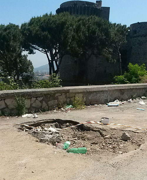 Voragine in via Castello a Castellammare: a rischio l'incolumità di passanti ed automobilisti. Il tutto a pochi metri dall'abitazione di Maria Rita Auricchio, vicesindaco nonché assessore alla Legalità e Controllo del Territorio con Deleghe alla Polizia Urbana e Rurale. Secondo quanto si apprende l'impressionante quanto pericolosissima buca sarebbe il frutto di lavori effettuati dalla compagnia che gestisce i servizi idrici in città ovvero la società Gori. L'opera alla rete idrica avrebbe prodotto la voragine che è stata riempita con della terra e sembrerebbe che una volta c'era anche del nastro bianco e rosso a delimitarlo. Una situazione rischiosissima per gli abitanti della zona collinare stabiese a pochi passi dal castello medievale già troppo spesso "bersagliati" dal dissesto idrogeologico non tenuto abbastanza sotto controllo. "Mi chiedo - ha detto il consigliere comunale del Partito Democratico Francesco Russo - chi debba controllare i lavori che conduce questa società specialmente su queste zone sensibili? La Gori gestisce il bene pubblico per eccellenza facendolo pagare a caro prezzo e gli consentiamo anche di fare i propri comodi devastando strade. E dunque: chi è tenuto al controllo? Nelle altre città e in penisola sorrentina la Gori opera come a Castellammare? A me risulta di no".