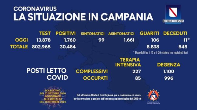 Forte balzo in avanti dei contagi in Campania. Nelle ultime 24 ore sono stati 1.760 rispetto ai 1.312 di ieri. I tamponi effettuati sono stati 13.878 contro i precedenti 10.205. I morti sono 11, deceduti tra il 17 ed il 20 ottobre ma registrati nella giornata di ieri. Sul totale dei 1.760 positivi, 99 sono sintomatici e 1.661 asintomatici. Il totale dei positivi in Campania dall'inizio dell'emergenza è ora di 30.484 mentre i tamponi effettuati sono stati 802.965.