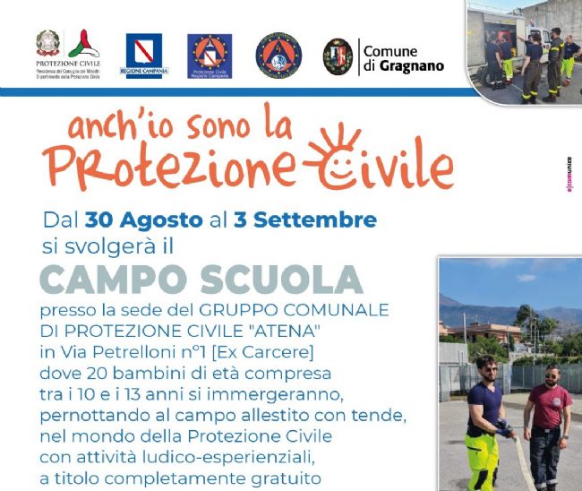 È stato emanato l’avviso pubblico per partecipare al Campo Scuola “Anch’io sono la Protezione Civile 2023”, destinato a 20 ragazzi di età compresa tra i 10 e i 13 anni compiuti, residenti nel Comune di Gragnano. Un progetto formativo totalmente gratuito che porterà ad accrescere nei ragazzi la conoscenza del Piano comunale di Protezione Civile e di temi importanti in termini di prevenzione anche grazie alla presenza di componenti operative del Servizio nazionale di Protezione civile (Vigili del Fuoco, Comune, Carabinieri, Polizia Municipale) e altre organizzazioni a supporto con attività parallele (comunicazione, orientamento nello spazio, montaggio tenda ministeriale, rispetto dell’ambiente e tutela della flora e fauna del territorio).