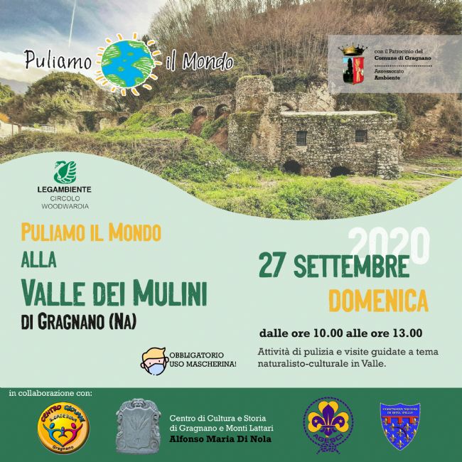 Il Circolo Legambiente Woodwardia, in collaborazione nell'organizzazione e gestione dell'evento con le associazioni "Centro Giovani S. Caterina", "Centro di Cultura e Storia di Gragnano e Monti Lattari Alfonso Maria di Nola", "Gruppo Scout Gragnano Agesci" e "Compagnia Arcieri di Real Valle", aderisce all'iniziativa nazionale di Puliamo il Mondo 2020 domenica 27 settembre dalle ore 10 alle ore 13 presso la Valle dei Mulini di Gragnano.