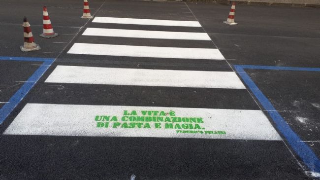 Le strisce pedonali che raccontano della città. Da Totò a Federico Fellini, senza dimenticare la bellissima Sophia Loren, sono state scritte ieri a Via Castellammare le frasi più celebri durante il rifacimento della segnaletica stradale. «La vita è una combinazione di Pasta e magia» Federico Fellini, « … se non è Gragnano, desisti!» Totò. «Tutto quello che vedete lo devo agli spaghetti» Sophia Loren. A renderlo noto, il sindaco Nello D’Auria sulla pagina social ufficiale. «Le strisce pedonali di Via Castellammare parlano di Gragnano e di alcune delle sue eccellenze. Se ami la tua città, la valorizzi… anche attraverso chi l’ha amata prima di noi e ne ha parlato in ogni angolo del mondo.»