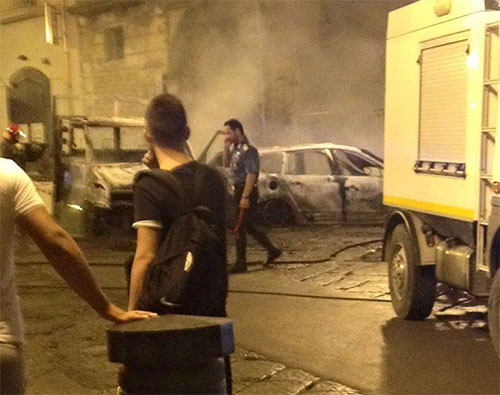 Un boato, poi le fiamme. Notte da incubo per i gragnanesi. In piazza Aubry un'auto ed un camion sono stati incendiati. Tutto è accaduto verso le 2 di questa notte quando prima uno scoppio e poi una grossa nube di fumo nero ha svegliato i residenti della zona.
