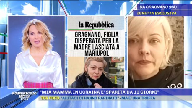 E’ disperata per sua madre, rimasta in Ucraina nel bel mezzo della guerra. Si chiama Elena, ha origini ucraine e vive a Gragnano. Ieri è stata ospite a Pomeriggio 5, programma condotto da Barbara D’Urso, dove ha espresso le sue preoccupazioni per la mamma e il resto della famiglia, bloccati nel suo paese da undici giorni. L’ultima volta che l’ha sentita, racconta, la sua casa veniva bombardata dagli aerei russi: «Mi ha detto di essersi barricata nella sua abitazione a Mariupol. Ha cibo per un mese e medicinali. C’era la macchina per partire, ma lei non se l’è sentita di lasciare il paese. N’è se la sente di rifugiarsi in cantina, poiché dovesse crollare tutto, non ci sarebbe nessuno che verrebbe ad estrarla dalle macerie. L’ultima volta che l’ho sentita è stata il 26 febbraio alle ore 17. Il giorno dopo abbiamo saputo che la nostra casa è stata bombardata. Hanno staccato acqua, corrente, gas. È come se avessero bloccato le line telefoniche lungo tutto il perimetro del paese.» Poi racconta della sorella. «è scappata da Kiev con una bambina di otto anni. Mi ha detto che hanno iniziato a bombardare anche stamattina e la sua preoccupazione è che possano mirare anche agli ospedali. Non c’è un corridoio umanitario. Se non sono morti per via dei bombardamenti, non so come faranno a sopravvivere.»