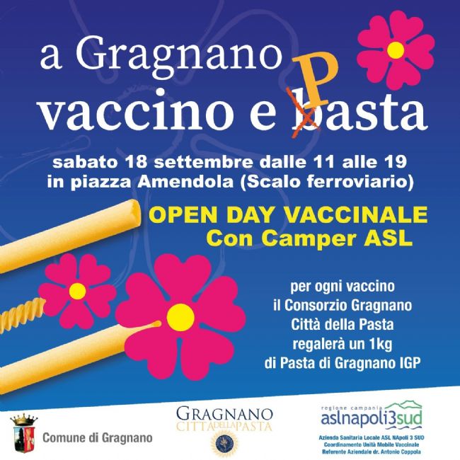 Un chilo di pasta a chiunque si vaccini. In occasione dell'Open Day che avrà luogo in Piazza Amendola (Scalo Ferroviario) a Gragnano a ogni cittadino che si sottoporrà al vaccino anti-Covid verrà consegnato un pacco di pasta di Gragnano IGP. Un'iniziativa promossa dall'Asl Napoli 3Sud, in collaborazione con il Consorzio Gragnano Città della Pasta, per sollecitare i cittadini alla somminsitrazione della dose. Appuntamento, dunque, a sabato 18 settembre dalle ore 11 alle 19, senza prenotazione.