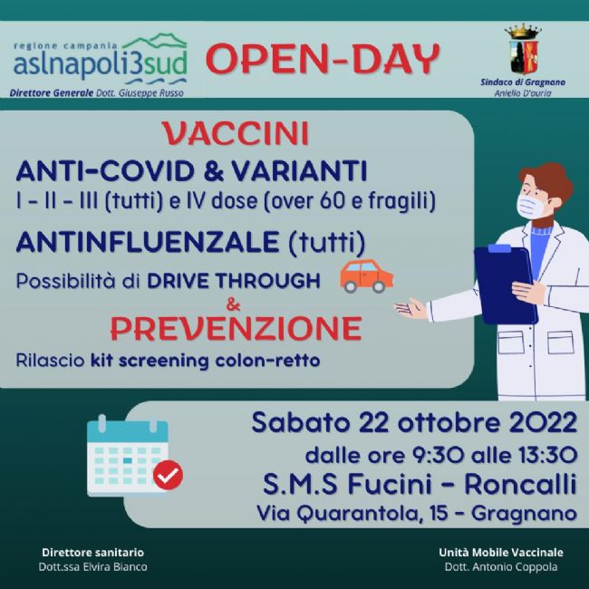 Entrambe le iniziative, organizzate dal responsabile Antonio Coppola su impulso del direttore generale Giuseppe Russo, prevedono, oltre la somministrazione del vaccino anticovid e varianti prima, seconda e terza dose per tutti e quarta dose per anziani over 60 e fragili, anche la possibilità, per tutti, di ricevere la vaccinazione per l'influenza stagionale.