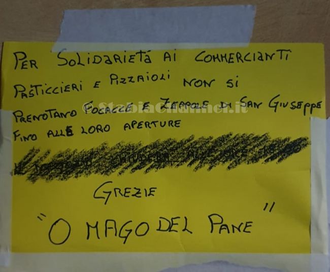 “Per solidarietà ai commercianti pasticcieri e pizzaioli, non si prenotano focacce e zeppole di San Giuseppe fino alla loro riapertura”. Questo il messaggio scritto su un cartello affisso all’esterno di una panetteria del Parco Imperiale a Gragnano.