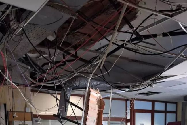Il pesante macchinario dell'aria condizionata si è improvvisamente staccato dal suo ancoraggio e cadendo ha provocato anche il crollo di molti pannelli di cartongesso della controsoffittatura e di alcune tubature.