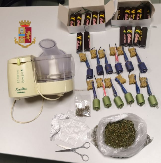 Stamattina gli agenti del Commissariato di Sorrento, durante un servizio di contrasto allo spaccio di sostanze stupefacenti, hanno effettuato un controllo presso l'abitazione di un giovane in via Cristoforo Colombo a Massa Lubrense in cui hanno rinvenuto, nascosta in un deposito, una busta contenente 58 grammi circa di marijuana, materiale per il confezionamento della droga, 12 botti pirotecnici artigianali e 16 petardi “super cobra” illegali poiché privi della classificazione.