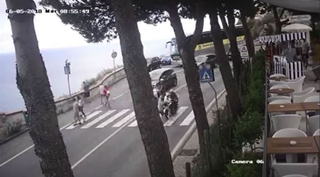 Incidente stradale slla SS145 "Sorrentina". Due pedoni, probabilmente turisti, sono stati investiti da uno scooter mentre attraversavano la strada sulle strisce pedonali. Un incidente ripreso dalle telecamera di videosorveglianza su una attività commerciale situata proprio sul luogo dove è avvenuto l'incidente.