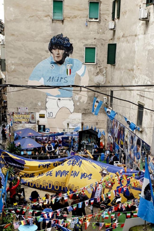 E' la festa dei napoletani che si sentono calcisticamente argentini, ma anche degli argentini di Napoli che hanno scelto i Quartieri per la festa davanti al grande ritratto di Maradona.