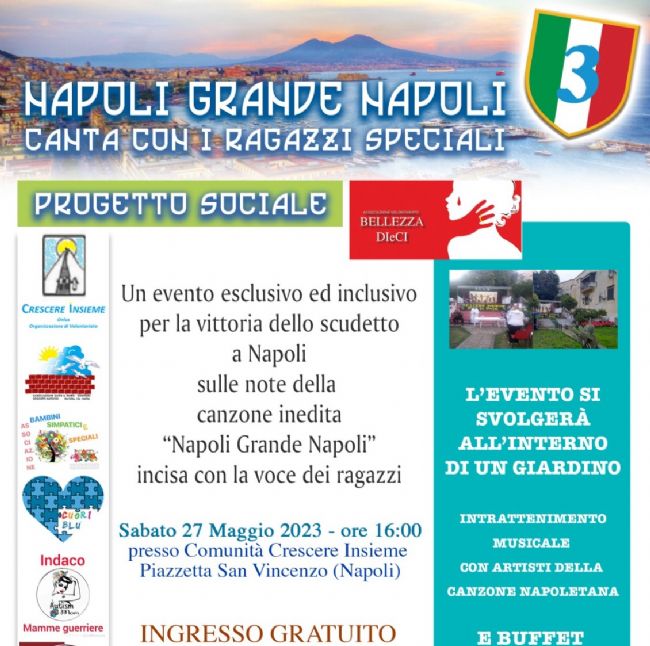 Sabato 27 maggio a partire dalle ore 16.00 presso la sede della Comunità Crescere insieme – Piazzetta S. Vincenzo n. 25 prenderà il via il progetto sociale “Napoli grande Napoli … canta insieme con i ragazzi speciali”, ideato dal team del Centro Rete Solidale (CRS) vede coinvolti ragazzi con disturbi di autismo e non solo. L’idea di progetto è quello di far partecipare questi ragazzi e farli sentire parte integrante di una festa che non li esclude dal gioire con noi tutti e le loro famiglie. Per l’occasione della vittoria della SSC NAPOLI: - è stato inciso il brano “Napoli Grande Napoli” dagli autori D. Alfano/S. Russo, cantato insieme ai ragazzi parte delle associazioni coinvolte - è stata organizzata una piccola festa a misura per ragazzi e famiglie. Sarà il primo evento a Napoli e tra i primi in Italia (come il Concertone del 1 maggio), a rilasciare un suo NFT attestante la partecipazione alla manifestazione lasciando traccia di questa giornata.