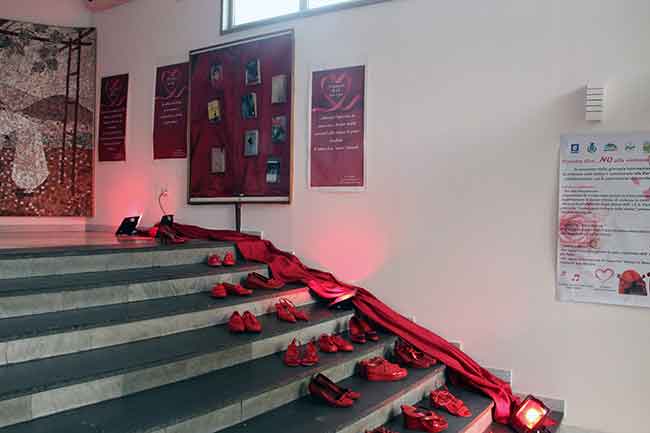 “L’esposizione – spiega Lucia Somma è articolata in 4 momenti: il primo inteso alla valorizzazione del ruolo della donna quale custode della vita attraverso un manufatto artistico storicamente presente in casa comunale. Il secondo alla sensibilizzazione culturale attraverso una rassegna bibliografica legata alla tematiche della violenza di genere; il terzo inteso alla memoria di chi non c'è più, vittima di amore criminale (le scarpe rosse ne sono il simbolo), mentre il Il quarto va interpretato come speranza in un mondo libero dalla violenza: si dice che il batter d'ali di una farfalla possa provocare un uragano”.
