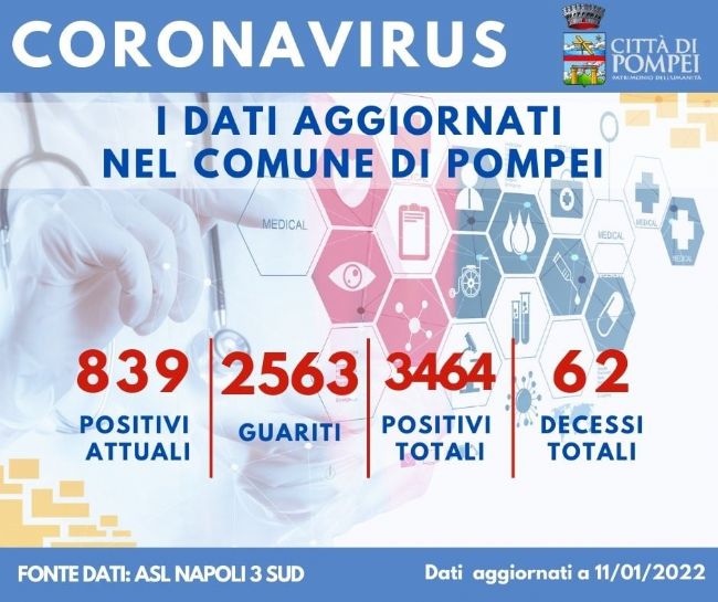 Cresce il numero dei contagi nella città di Pompei. Il bollettino epidemiologico ha reso nota in data odierna la positività al Covid-19 di ulteriori 129 cittadini. Al contempo, sono 7 le persone guarite dal virus. Pertanto, il numero dei cittadini attualmente positivi è di 839. Questo quanto reso noto sulla pagina social ufficiale del sindaco Carmine Lo Sapio. Da inizio pandemia sono 3464 le persone che hanno contratto il virus, mentre 2563 il numero di persone guarite.