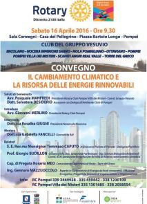 Si terrà sabato 16 aprile alle ore 9.30 presso la sala convegni Casa del Pellegrino, sita a Pompei in Piazza Bartolo Longo, il convegno dal titolo “Il cambiamento climatico e la risorsa delle energie rinnovabili”. L’evento, patrocinato dal Rotary Club Pompei, sarà introdotto dall’avvocato Giovanni Merlino, presidente del club, e dalla dottoressa Rosalba Giugni, Presidente Nazionale Marevivo. Modererà la dottoressa Gabriella Fancelli, giornalista Rai. Interverrà il Monsignor Tommaso Caputo, Arcivescovo di Pompei, il professor Giorgio Budillon, il capitano di fregata Rosario Meo e l’ingegner Gennaro Mazzuoccolo, esperto in Generazione di Energia da fonti rinnovabili.