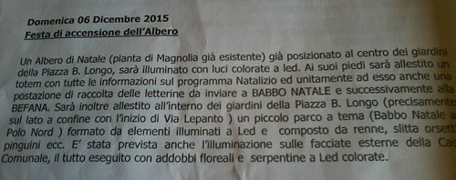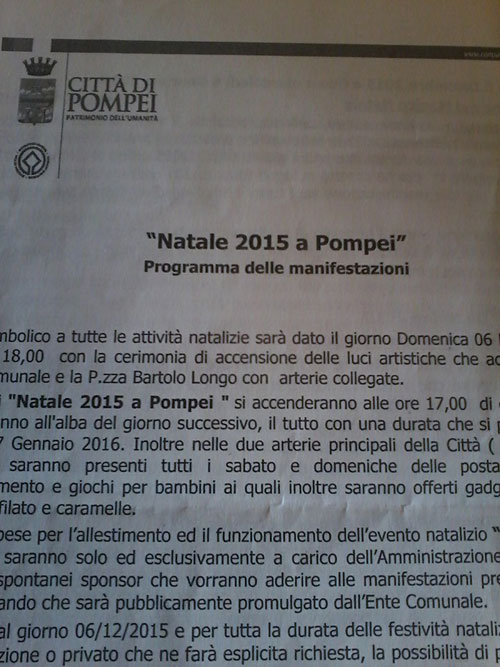 Festività natalizie 2015. A Pompei è una corsa contro il tempo per addobbare la città. Fino alle ore 14:00 di oggi, nessuna luminaria è stata ancora montata per le vie del centro cittadino. In ‘compenso’, però, si vedono diversi operai su via Lepanto, impegnati ad asfaltare il manto stradale per cancellare i ‘segni’ lasciati dai lavori per la fibra ottica, con molti disagi per il traffico. Nessun avviso è stato infatti affisso per impedire ai veicoli di parcheggiare, così da agevolare magari i lavori. Intanto sotto al municipio è stato predisposto un abete che sarà certamente addobbato nelle prossime ore. Stando però a quanto si legge nel programma delle manifestazioni intitolato “Natale 2015 a Pompei”, presentato dall’assessore Salvatore Desiderio lo scorso 19 novembre, in una conferenza stampa tenutasi a palazzo De Fusco, come albero di Natale viene indicato una “pianta di magnolia già esistente, posizionata al centro dei giardini della piazza Bartolo Longo”. Si deduce allora che forse c’è stato un cambio di programma, oppure che si è deciso all’ultimo momento di preparare due alberi di Natale. Intanto, sempre per domani, giorno in cui si aprirà il Natale in città stando a quanto riportato nel documento, (il cartellone definitivo con tutti i dettagli non è stato ancora reso noto, gli amministratori si erano riservati di farlo in una conferenza stampa da indire tra il 2 o il 3 dicembre 2015) restano da preparare diverse cose. Inizierà domani il Natale a Pompei? “Lo scopriremo solo vivendo”, rispondendo con le parole di una nota canzone.
