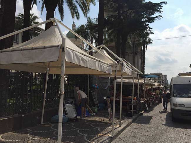 «Sono stati rimontati i sei gazebi del tratto cieco di via Roma. La ditta Allestimenti Di Paolo ci è venuta incontro, praticando un forte sconto. Pagheremo noi per il noleggio. Per gli altri tre gazebi di piazza Anfiteatro, invece, i colleghi hanno deciso di regolarsi diversamente». Questo è quanto fa sapere Domenico Volpe, uno degli ambulanti del tratto cieco di via Roma. I nove gazebi erano stati smontati a sorpresa, di notte, dalla ditta che ne è proprietaria. Una decisione maturata in un clima d’esasperazione per l’insolvenza nei pagamenti del Comune di Pompei. La vicenda parte da lontano e chiama in causa la precedente amministrazione comunale guidata dall’ex sindaco Claudio D’Alessio. Domenico Volpe ricostruisce la vicenda nei dettagli. «Nel 2013 l’ex primo cittadino commissionò verbalmente alla ditta Allestimenti Di Paolo, l’installazione di nove gazebi, sei dei quali da montare nel tratto cieco di via Roma e tre in piazza Anfiteatro, nei pressi dell’ingresso degli scavi archeologici. Un incarico mai formalizzato con la stipula di un apposito contratto. A gennaio del 2014 D’Alessio è stato sfiduciato e la ditta si è ritrovata a dover fare i conti con un difetto di forma della fornitura. L’attuale amministrazione comunale purtroppo – spiega ancora Volpe – non ha potuto pagare i circa 40mila euro spettanti alla Allestimenti Di Paolo, perché non c’è nessun documento ufficiale che attesti la fornitura resa. L’incarico è stato affidato verbalmente e, come si dice, scripta manent verba volant. Ora si capisce chiaramente perché i gazebi sono stati smontati di notte. Noi ambulanti non sapevamo nulla di questo retroscena. Quando abbiamo saputo come stavano realmente le cose, dopo esserci consultati, abbiamo deciso di contattare la ditta per capire se potevamo sostenere la spesa per il noleggio dei gazebi. Grazie allo sconto che ci è stato gentilmente praticato, abbiamo deciso di riprenderli pagando di tasca nostra. Stamattina sono stati rimontati e siamo tornati a lavorare con la stessa organizzazione di prima, avendo cioè le coperture che ci riparano dal sole cocente».