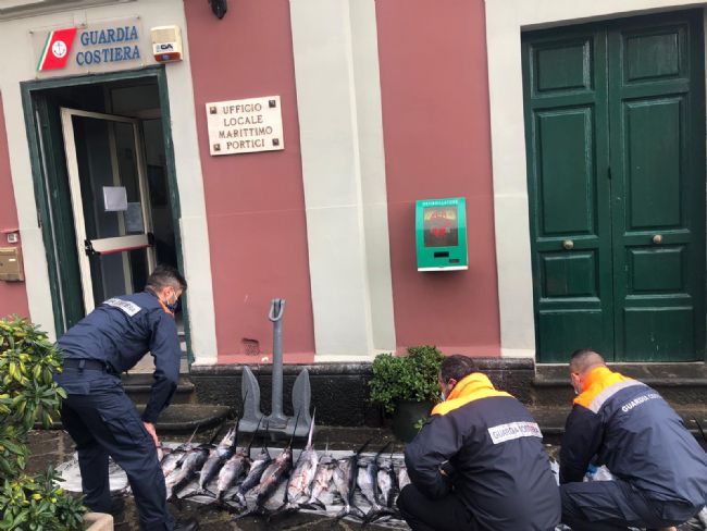 Nella mattinata odierna (12 novembre 2021), personale della Guardia Costiera di Torre del Greco e del dipendente Ufficio Locale Marittimo di Portici, nell’ambito delle consuete ed istituzionali attività di vigilanza e controllo a tutela dell’ecosistema marino e delle filiere ittiche, sotto il coordinamento della Direzione Marittima della Campania, ha intercettato, sull’arenile in prossimità del “Lido Arturo”, nel tratto di giurisdizione del Comune di Ercolano (NA), un’attività di sbarco illegale di n. 30 esemplari di pesce spada, tutti al di sotto della taglia minima consentita, ai fini della cattura e della successiva commercializzazione