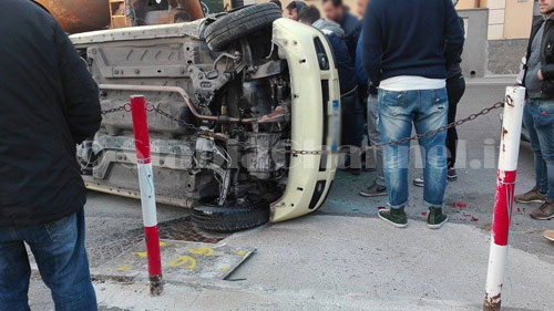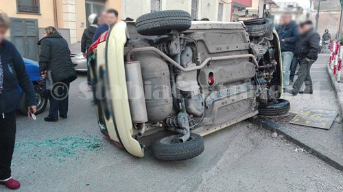 Il tutto è successo alle 16.30 circa in via Polveriera, a poche centinaia di metri dalla piazza principiale della città. Una Fiat Panda di colore giallo ha urtato contro il marciapiede di una macelleria, ribaltandosi su di un lato. Nella carambola, la piccola utilitaria ha sbattuto contro una Citroen C3 celeste parcheggiata ed un motorino. Una serie di scontri che, fortunatamente, non ha coinvolto pedoni o altri automobilisti. Alla base dell'incidente ci sarebbe un malore che avrebbe colpito la 37enne al volante della Panda. La donna avrebbe per questo perso il controllo dell'auto ed invaso la carreggiata opposta mentre viaggiava in direzione Sant'Antonio Abate.