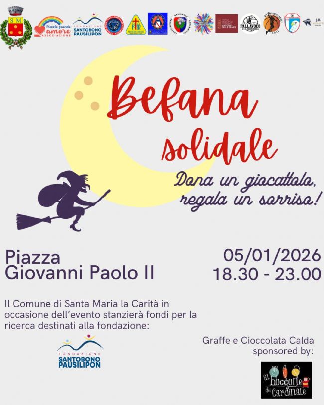 Lunedì 5 gennaio, dalle ore 18.30 alle ore 23 in piazza Giovanni Paolo II di Santa Maria la carità l'amministrazione comunale, l'associazione Piccolo Grande Amore e le altre realtà associative del territorio scendono in campo per strappare un sorriso e regalare un giocattolo nuovo ai bambini e alle bambine dei reparti di pediatria degli ospedali della zona, che verranno consegnati il giorno 6 gennaio dai delegati delle associazioni.