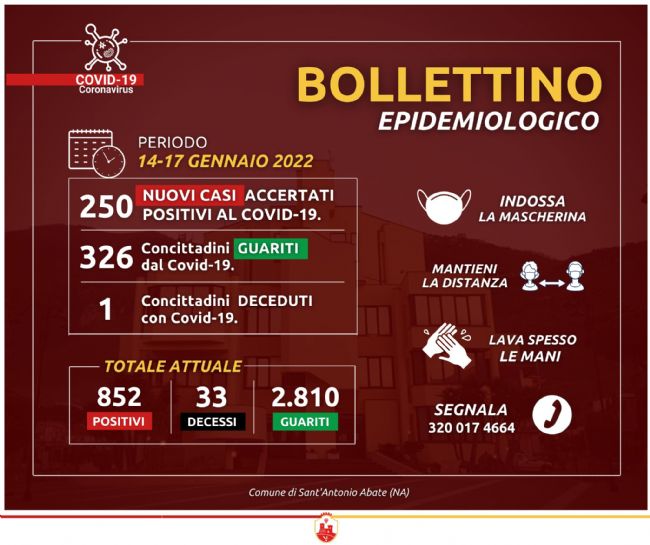 Il bollettino di questa mattina riporta 250 nuovi positivi ma anche 326 guariti. C'è purtroppo da registrare anche un decesso. «Questi dati infondono in noi molta speranza - ha commentato il sindaco Ilaria Abagnale - , in quanto sono più di 300 i concittadini ritornati alla vita quotidiana, ma al contempo ci confermano quanto il virus sia in continuo circolo ed attacchi ancora gravemente il sistema immunitario.
