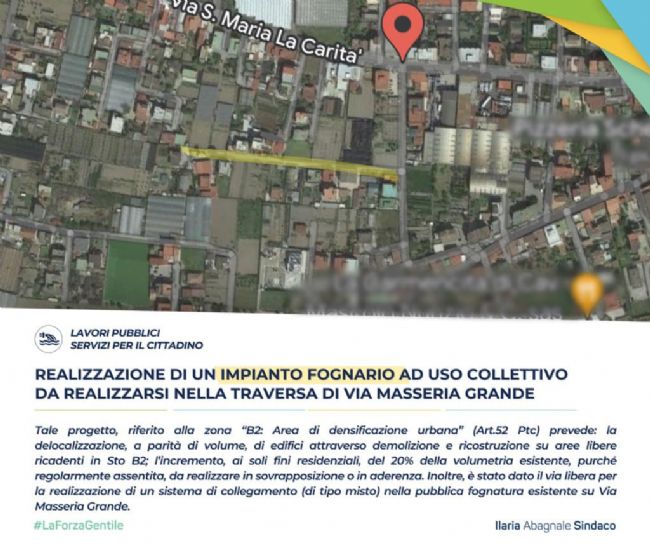 Con la giunta n. 72 del 6 aprile 2022 è stato approvato il progetto di fattibilità tecnica ed economica per la realizzazione di un impianto fognario ad uso collettivo su iniziativa privata, da realizzarsi nella traversa di Via Masseria Grande.