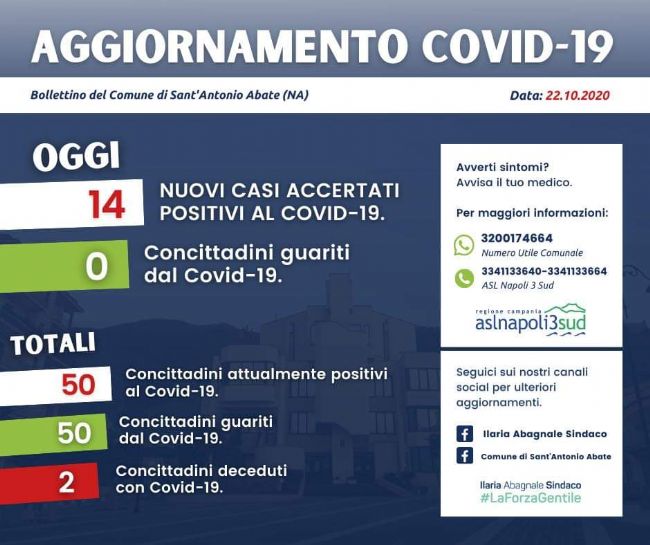 Sale la curva dei contagi nel territorio di Sant’Antonio Abate. I positivi attuali, a seguito della registrazione degli ultimi 14 nuovi casi accertati di quest’oggi, salgono a 50.