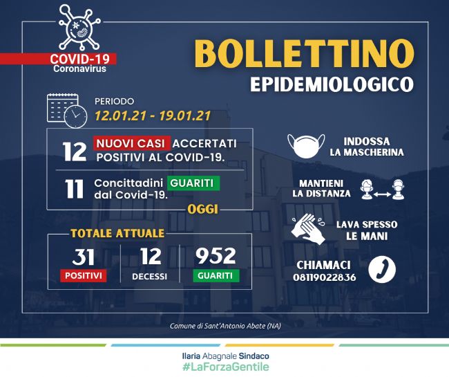 La prima cittadina abatese Ilaria Abagnale ha reso noto ieri il bollettino epidemiologico, secondo il quale sono stati registrati, nell'arco di una settimana, altri 12 positivi al Covid-19. Al contempo, sono 11 i cittadini che hanno sconfitto il virus. Pertanto, il numero dei cittadini attualmente positivi è di 31. Di seguito le parole della sindaca: