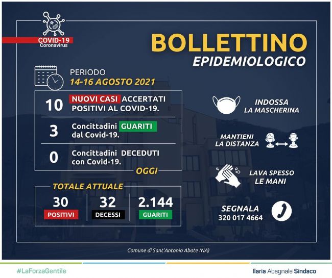 Nuovo aggiornamento dettagliato sui residenti in paese dichiarati positivi al Covid-19, la cui lieve ma costante crescita numerica ha determinato un peggioramento della curva epidemiologica. Lo ha fornito il sindaco Ilaria Abagnale. Figurano per la prima volta in questa nuova ondata di contagi anche i guariti. Sono tre i cittadini abatesi che hanno terminato l’isolamento fiduciario e sono ritornati in comunità con nostro lieto e rinnovato benvenuto.