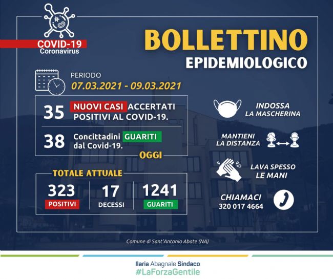 Il bollettino di ieri sera ha reso nota la positività al Covid-19 di altri 35 positivi a Sant'Antonio Abate. Al contempo, il numero dei guariti supera quello dei nuovi contagi: 38 persone hanno sconfitto il virus. Alla luce degli ultimi dati, il numero delle persone attualmente positive è di 323. Purtroppo, però, è giunta notizia della morte di un altro cittadino abatese a causa del Covid. La comunità è in lutto e sui social è arrivato il cordoglio della sindaca Ilaria Abagnale: