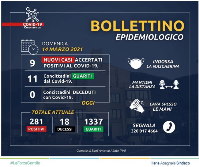 Il bollettino epidemiologico di ieri ha registrato 9 nuovi casi accertati, positivi al Covid-19 ed 11 guariti a Sant'Antonio Abate. Il numero delle persone attualmente positive è di 281.