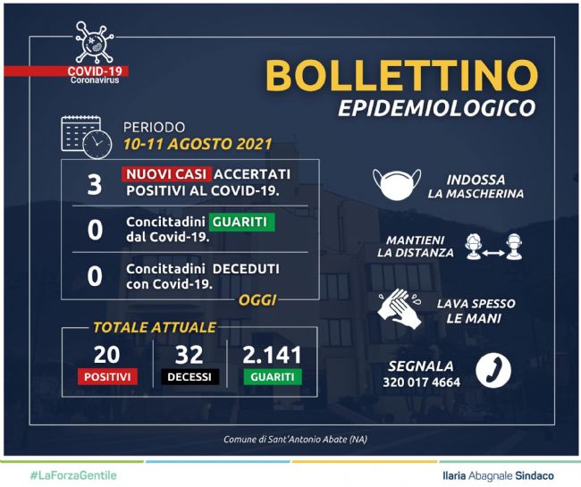 «Si confida nell’alto senso di responsabilità della cittadinanza. Vaccinarsi, lavare frequentemente le mani ed indossare i dispositivi di protezione individuale, anche in vacanza ed in qualsiasi circostanza, significa tutelare sé stessi ed evitare che possano subentrare, prima nel proprio nucleo familiare e poi nel territorio comunale, le varianti del virus, potenzialmente capaci di generare un forte squilibrio nel monitoraggio attivo. Abbiamo modo e capacità di tenere alla larga l’infezione da Covid-19. Forza, abatesi!»