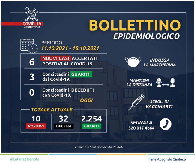 Nell’ultima settimana, il Comune di Sant’Antonio Abate ha registrato complessivamente 6 nuove positività al Covid-19 e 3 guarigioni. Sono dunque 10 i cittadini attualmente positivo. E' quanto annunciato dall'ultimo bollettino epidemiologico reso noto sulla pagina ufficiale Facebook del sindaco Ilaria Abagnale, la quale afferma: