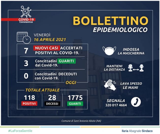 Conclude, la prima cittadina abatese, dicendo: «Mascherine, distanziamento e disinfezione delle mani restano le tre soluzioni utili al contenimento del contagio. Forza, abatesi!»