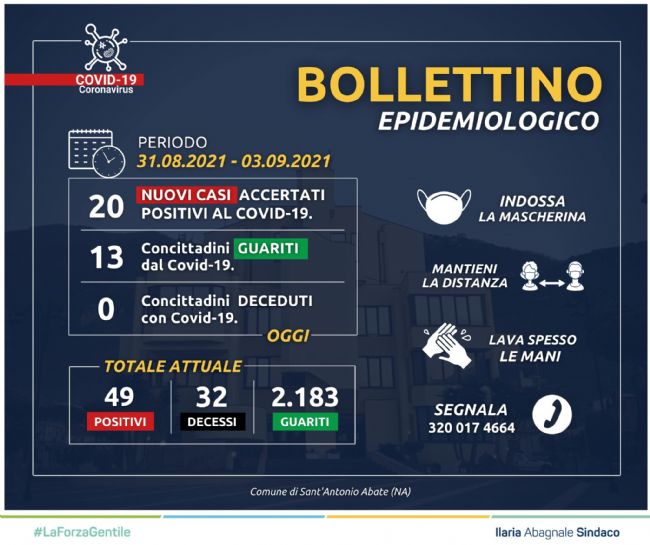 Il bollettino epidemiologico ha reso nota la positività al Covid-19 di ulteriori 20 contagiati negli ultimi 4 giorni a Sant'Antonio Abate. Al contempo, sono 13 i cittadini che hanno sconfitto il virus. Pertanto, il numero dei concittadini attualmente positivi al Covid-19 passa da 42 a 49.