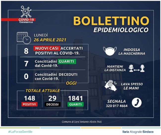 Il bollettino epidemiologico di Sant'Antonio Abate ha reso nota ieri sera la positività al Covid-19 di ulteriori 8 cittadini. Al contempo sono 7 le persone che hanno sconfitto il virus. Pertanto, il numero dei cittadini attualmente positivi è di 148. Di seguito le parole del sindaco Ilaria Abagnale: