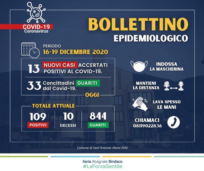 Nuovo bollettino riassuntivo del periodo 16-19 Dicembre, secondo il quale resta fortunatamente costante l’aumento dei guariti, che permette di decurtare il numero dei positivi attuali fino a 109. Sono 13 i nuovi positivi registrati negli ultimi giorni, mentre 33 abatesi hanno vinto la loro battaglia contro il virus.
